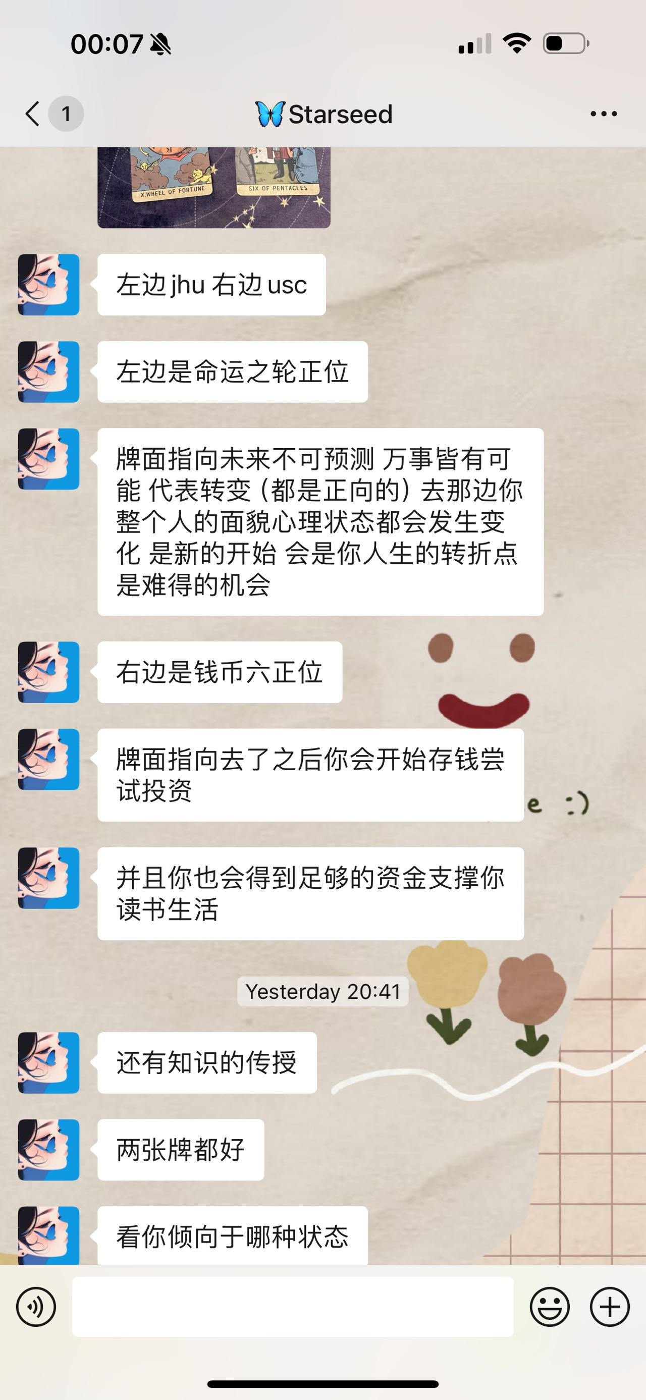 当时还请塔罗师傅看了一下,左边jhu 右边usc,跟星盘上给的信息非常像。